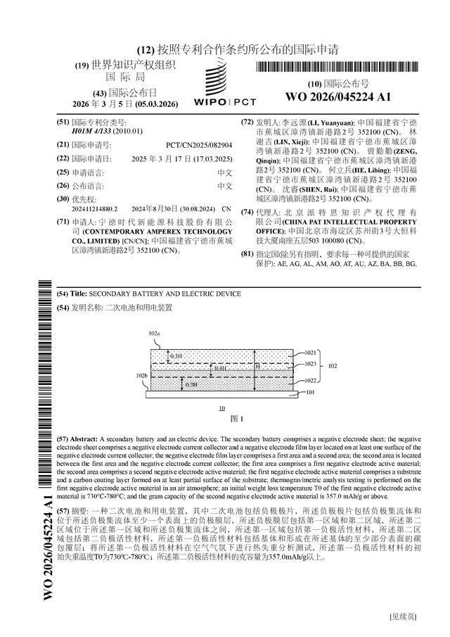 宁德期间公布国外专利央求:“二次电板和用电安装”