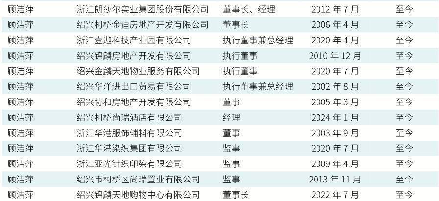 据瑞丰银行2024年年报,顾洁萍,1974年11月成就,中国国籍,研讨生学历,中共党员,高档经济师。历任浙江省租借公司职工,浙江华港染织有限公司总司理,本行监事。现任浙江朗莎尔维迪制衣有限公司总司理,浙江朗莎尔实业集团股份有限公司董事长,浙江壹迦科技产业园有限公司总司理,本行董事。